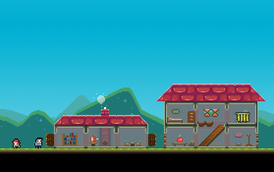 Updated the house tileset for easier use, bigger tiles, smaller pieces, added also some pixel items or objects, animated chimney smoke.